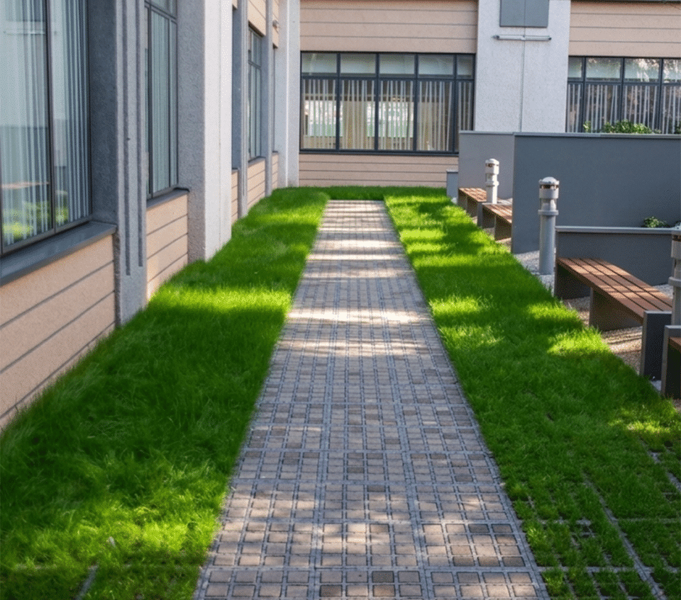 Selon les besoins du projet, ces applications peuvent prendre différentes formes : stationnement végétalisé, stationnement pavé ou minéral, parkings 100% perméable, voies d’accès pour véhicules légers ou engins de secours, ou encore aménagements paysagers. Chaque application est définie en fonction des contraintes techniques, esthétiques et environnementales du site.