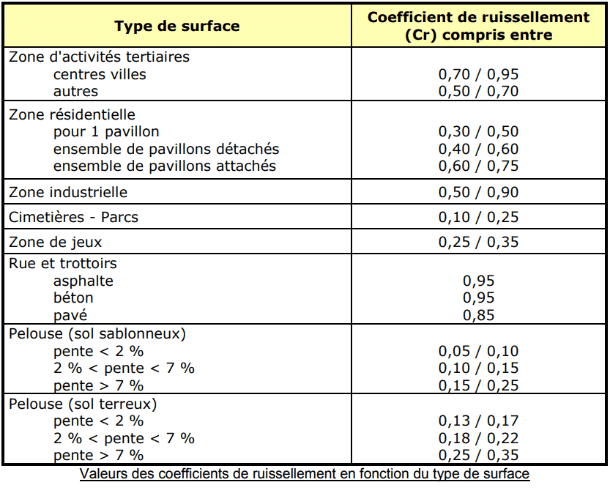 Le coefficient de ruissellement varie selon les surfaces et il existe plusieurs référentiels communément admis. Certains tableaux répertorient les valeurs moyennes de coefficients de ruissellement par :