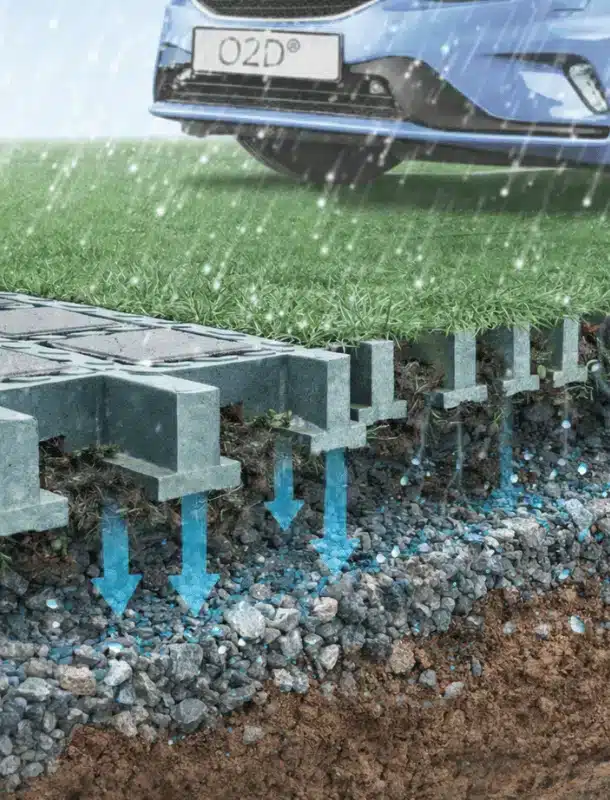 Les systèmes de sols O2D® sont développés autour d’un concept de sol « ouvert », perméable à l’eau et à l’air. Notre objectif : préserver les fonctions naturelles du sol et permettre l’infiltration des eaux pluviales à leur point de chute, sans ruissellement.