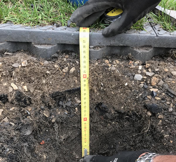 Mesure de l’enracinement au sein d’un système de sol végétalisé en dalles O2D GREEN (Laboratoire d’Analyses Microbiologiques des Sols, 2019).