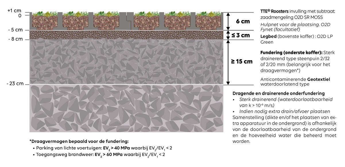 O2D MOSS-roosters worden gelegd op een dragende en drainerende fundering. De dikte van de fundering (en de noodzaak van een onderbouw) wordt bepaald op basis van het gebruik, de doorlatendheid van de ondergrond en de draagkracht ervan.