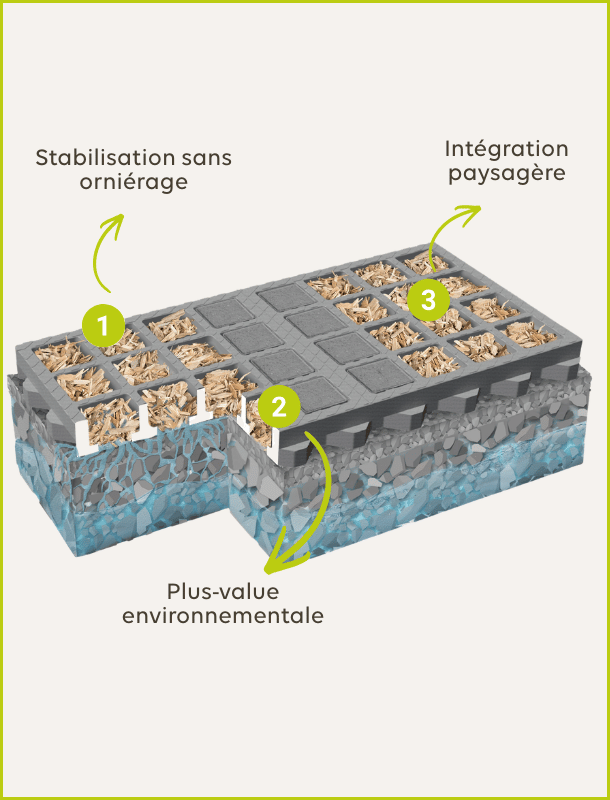 Grâce à sa structure porteuse et à son remplissage organique, elle permet de concevoir des parkings perméables durables conciliant performance technique et qualité environnementale.